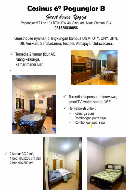 Convenientlyin the Mlati district of Yogyakarta, Cosinus PogungLor A dan B is located 4.2 km from Tugu Monument, 5.5 km from Yogyakarta Tugu Train Station and 5.7 km from Malioboro Mall. The property is6.5 km from Yogyakarta Presidential Palace, 6.5 km from Fort Vredeburg and 6.8 km from Museum Sonobudoyo. The holiday home provides rooms with air conditioning, free private parking and free WiFi.